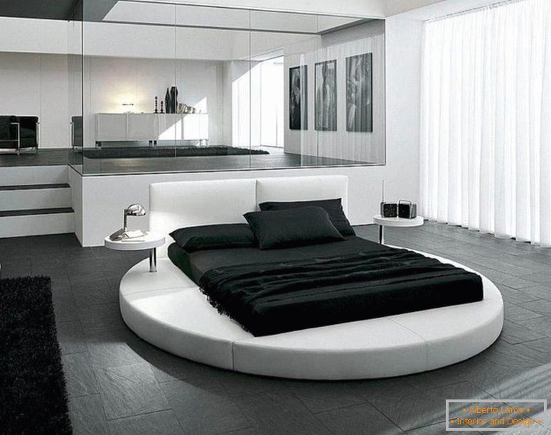 În interiorul strict al dormitorului, dacă se dorește, puteți adăuga un covor roșu, albastru sau violet aprins la poalele patului. Este perfect combinat cu un model similar pe abajururi.